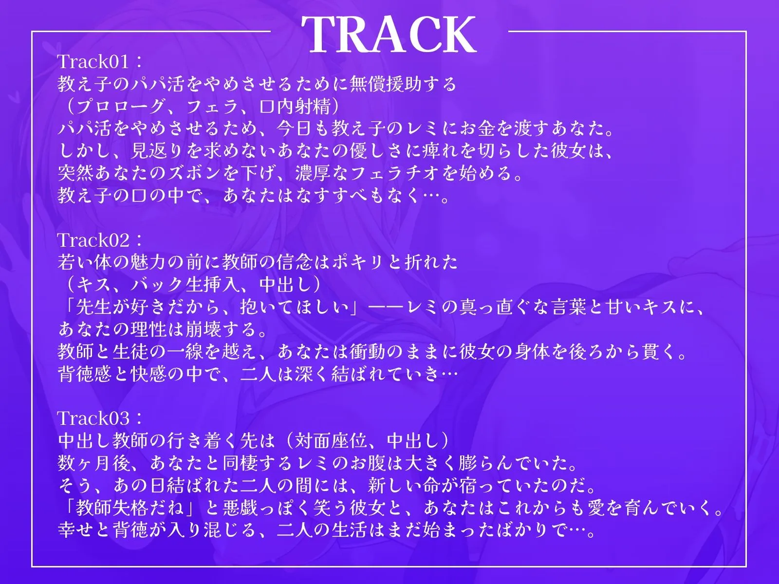 Track02:若い体の魅力の前に教師の信念はポキリと折れた(キス、バック生挿入、中出し)