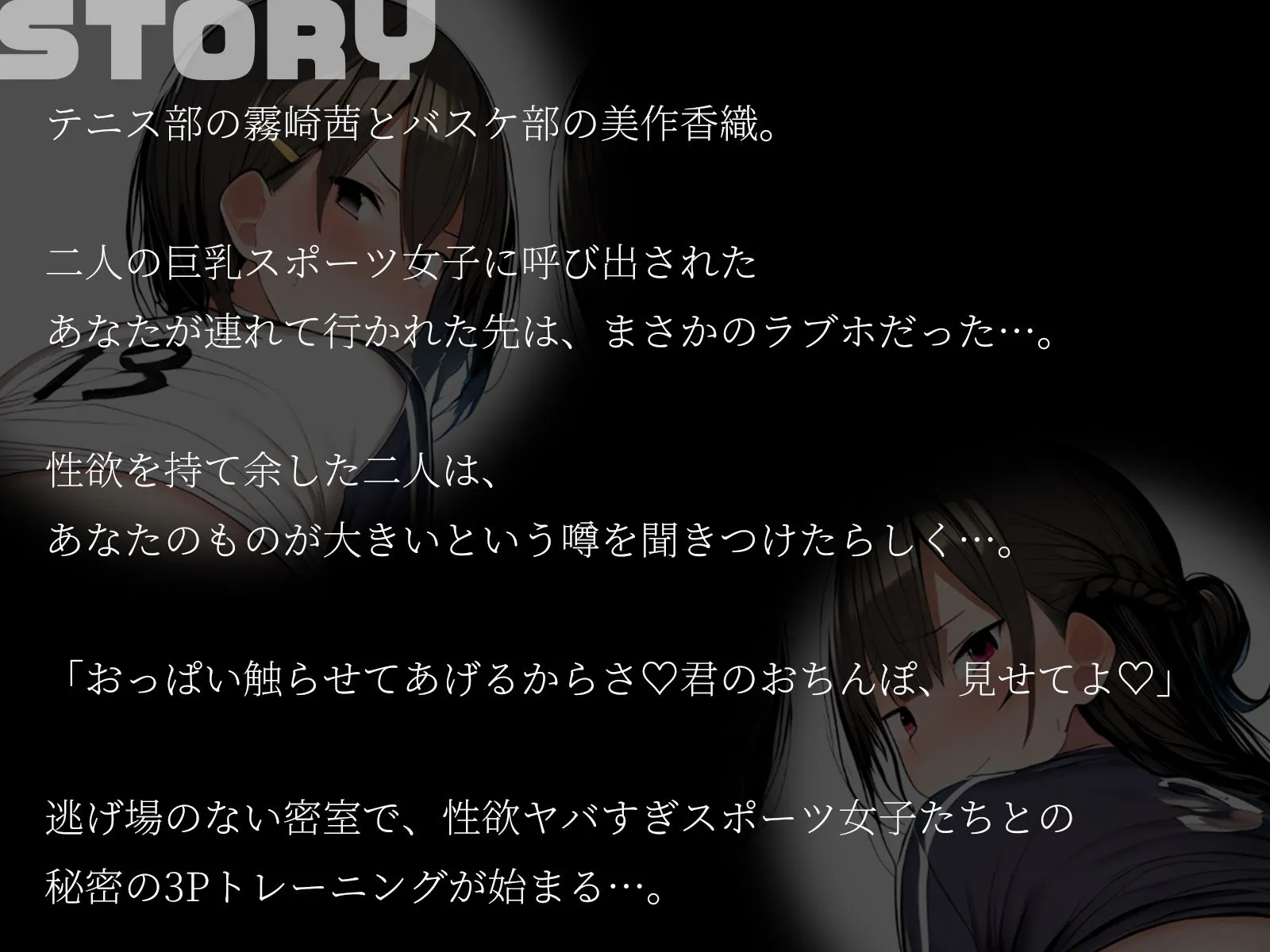 放課後、あなたはテニス部の霧崎茜とバスケ部の美作香織、二人の巨乳スポーツ女子に呼び出される。