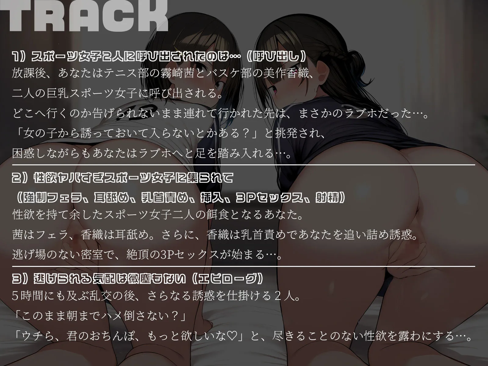 逃げ場のない密室で、性欲ヤバすぎスポーツ女子たちとの秘密の3Pトレーニングが始まる…。