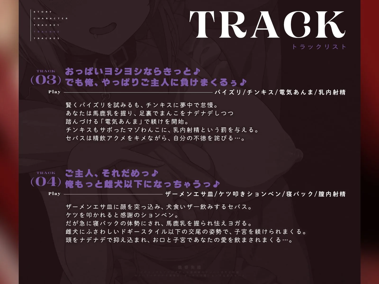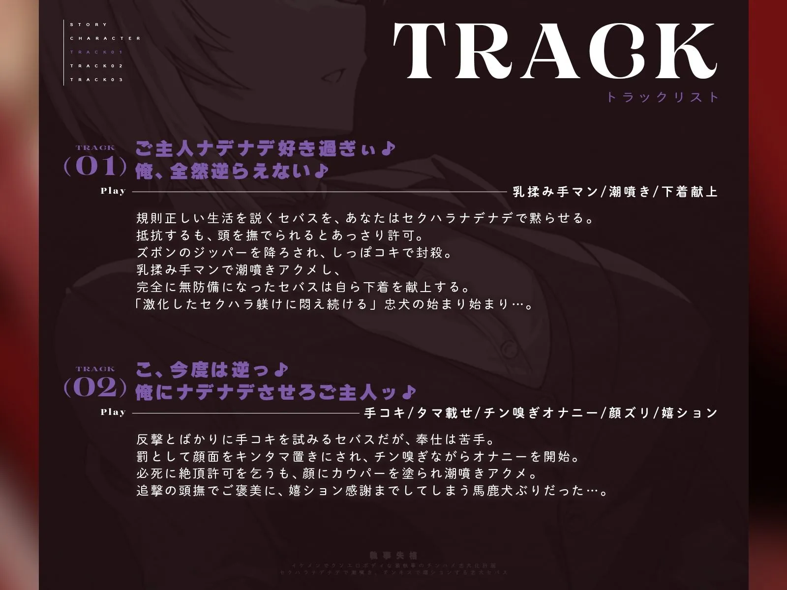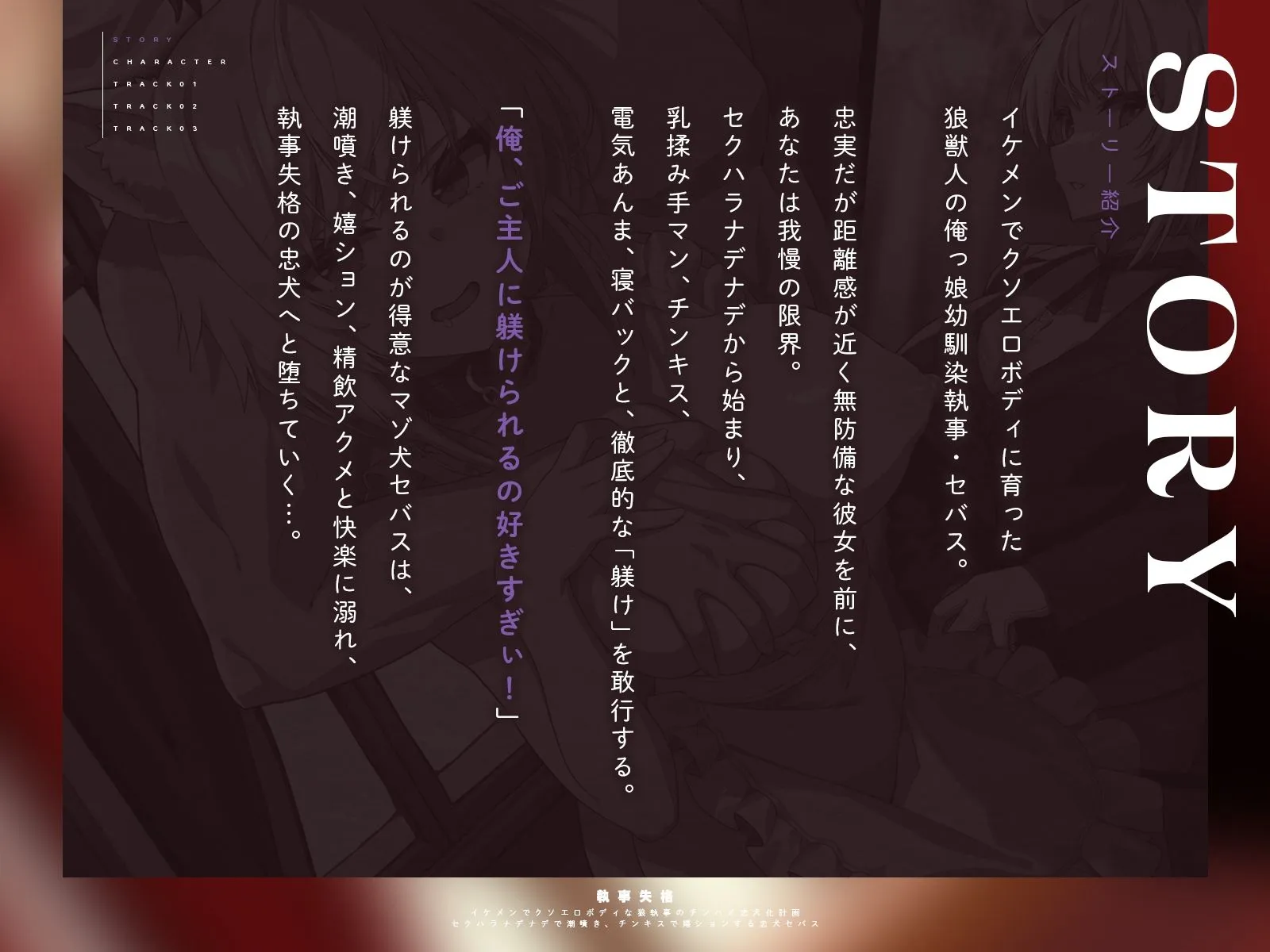 躾けられるのが得意なマゾ犬セバスは、潮噴き、嬉ション、精飲アクメと快楽に溺れ、執事失格の忠犬へと堕ちていく…。