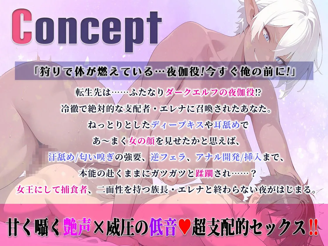 「狩りで体が燃えてる…夜伽役!今すぐ俺の前に!もう限界だ!欲しくてたまらん…っ!」ふたなりダークエルフの族長・エレナの夜伽役として異世界召喚させられたあなた。最初はねっとりディープキスや耳舐めで誘惑、狩りから帰るとドスの効いた声に豹変、汗まみれの全身舐め匂い嗅ぎ強要、逆フェラ、アナル挿入と威圧感のある支配者として本能のままに蹂躙。支配し、マゾメス堕ちさせることを最高の喜びとする族長に毎夜何度も犯●れ続けます