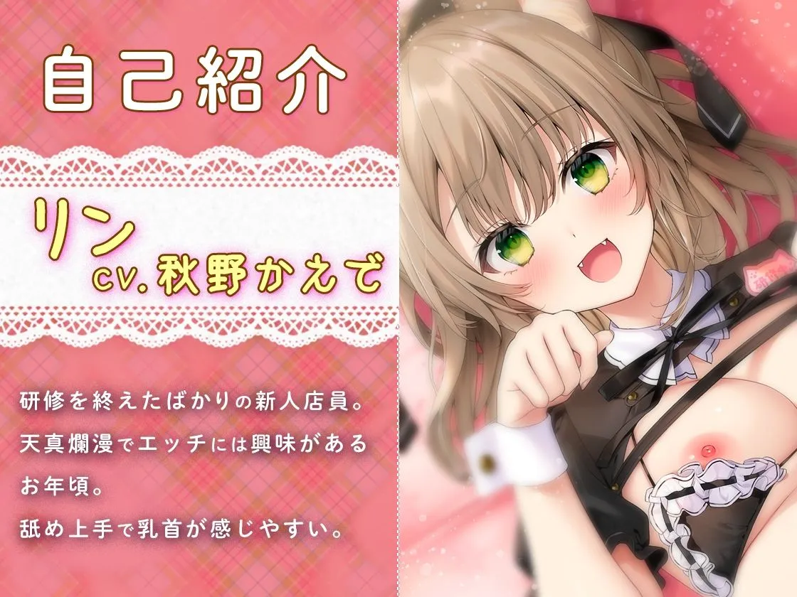 研修を終えたばかりの新人店員。天真爛漫でエッチには興味があるお年頃。舐め上手で乳首が感じやすい。
